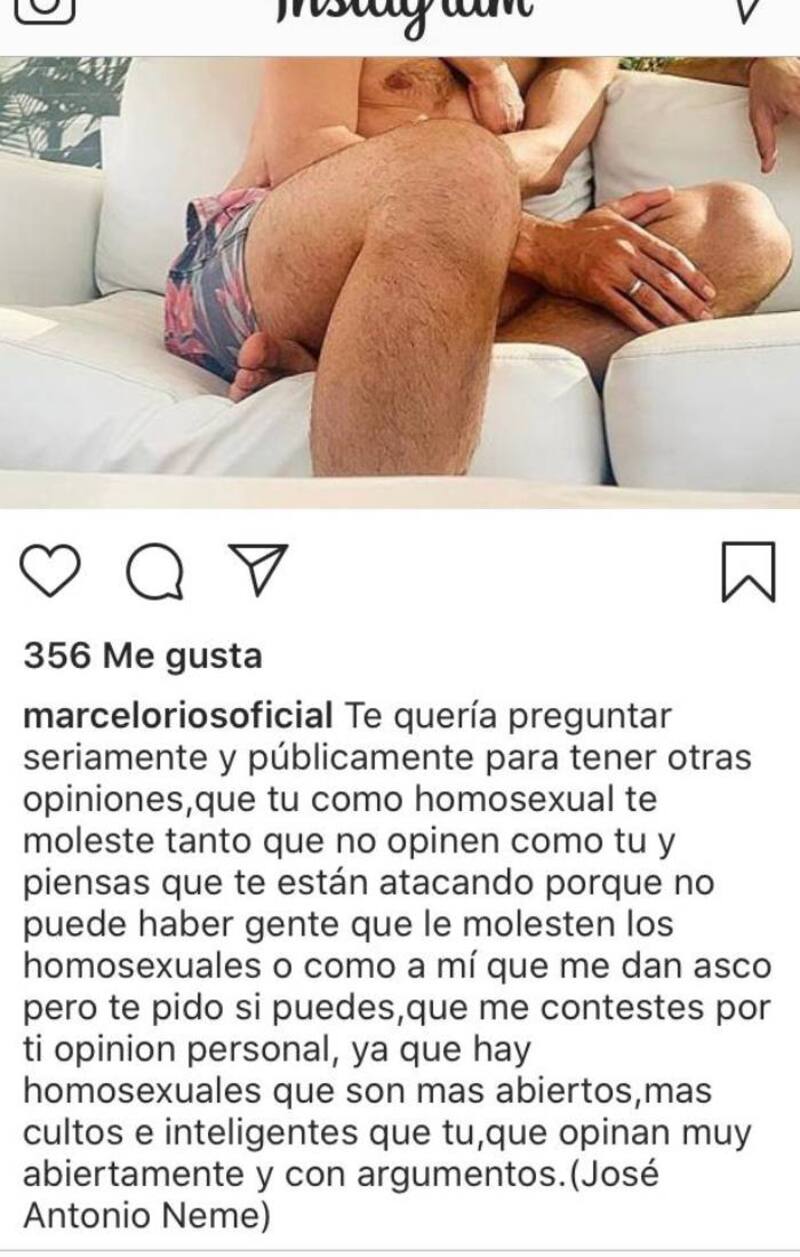 "Te quería preguntar seriamente y públicamente para tener otras opiniones, cual es la razón, que ustedes los homosexuales, les molesta tanto que no opinen como ustedes y piensen que los están atacando porqué no puede haber gente que le molesten los homosexuales o como a mi que me dan asco, pero quiero, si puedes que me contestes por ti personalmente, porque se que hay homosexuales que obviamente son mas abiertos, mas cultos e inteligentes que tu, que opinan muy abiertamente y con argumentos. (Antonio Neme)", escribió el Chino.