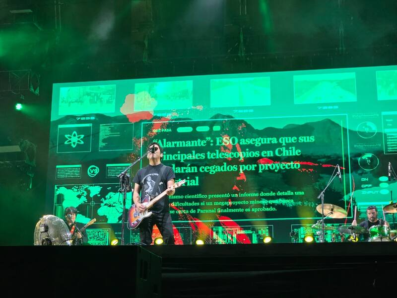 Así por ejemplo hizo gala de sus sencillos “Baile Mental”, “Cuándo todo está al revés” y “Rico el país”, esta última con una serie de titulares de noticias ambientalistas, intoxicados y la contaminación lumínica en los observatorios chilenos.