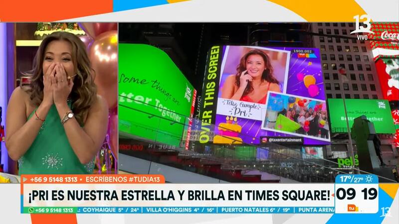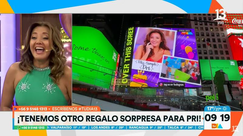 Tras mandarle un abrazo por su cumpleaños, el periodista le explicó que le tenían un especial regalo: “Tengo algo que contarte, porque muchos días dijimos ‘la Pri es la estrella que alumbra en nuestro matinal todas las mañanas’. El equipo de Tu Día en Estados Unidos, con la complicidad de Chile, de todos los que lo hicieron posible, dijimos: ‘Hagámosle un regalo especial a la Pri, hagamos a la Pri brillar en el día más brillante del año’”.