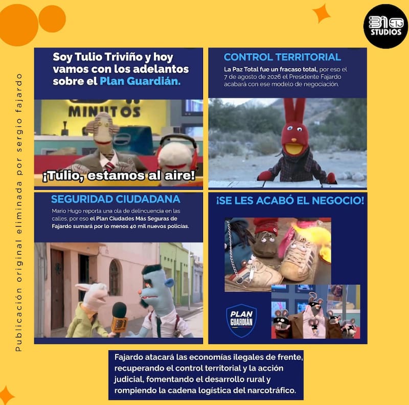 “Tulio Triviño. Mario Hugo y 31 Minutos presentan el Plan Guardián, la estrategia de seguridad que sacará a Colombia adelante”, escribió el candidato.