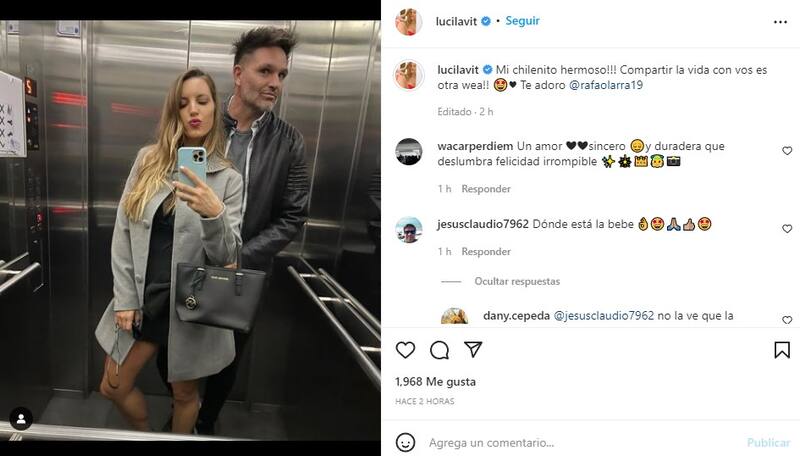 “Mi chilenito hermoso!!! Compartir la vida con vos es otra we… Te adoro @RafaOlarra19″, detalló en la red social mientras ambos posaban frente al espejo de un ascensor.