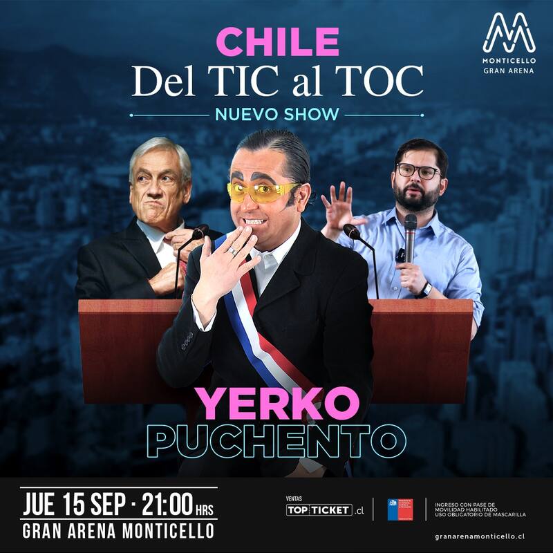 Por Camila MendozaCon guiños a Piñera, Boric y política: Yerko Puchento llega a Gran Arena Monticello con su show “Chile del Tic a Toc”