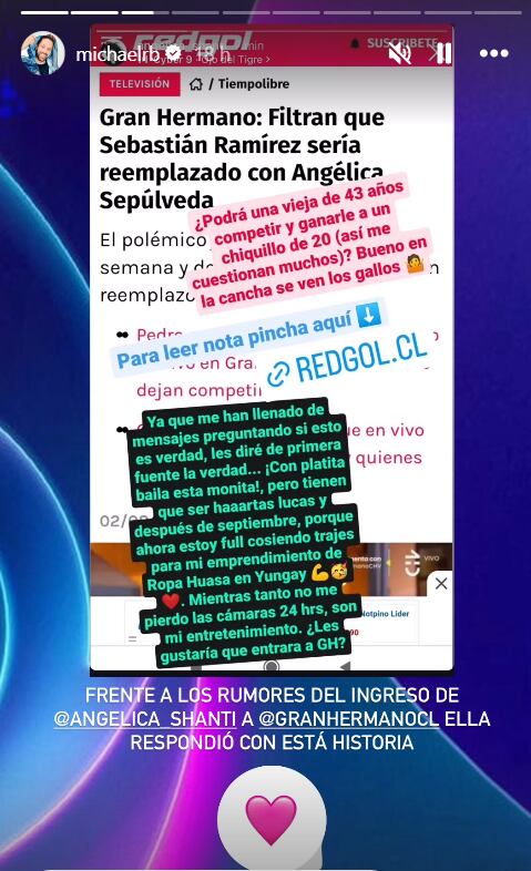 Más tarde, en otra publicación, Angélica reconoció que conoce a uno de los productores que trabaja en Gran Hermano.