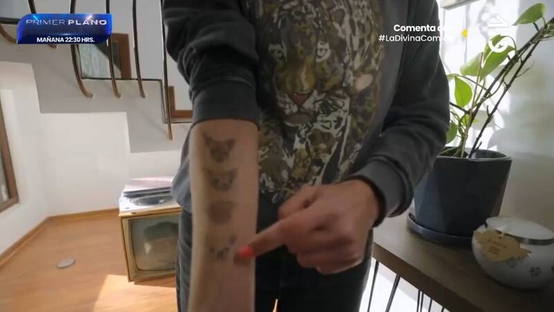 “Aquí, este lugar es muy importante y especial para mí, porque están mis cuatro perritos fallecidos, y también los tengo tatuados en mi piel. Mis cuatro chiquititos: Tango, Canela, Barry y Luna”, contó Carla, enseñando el tatuaje que tiene en su brazo en honor a sus mascotas.