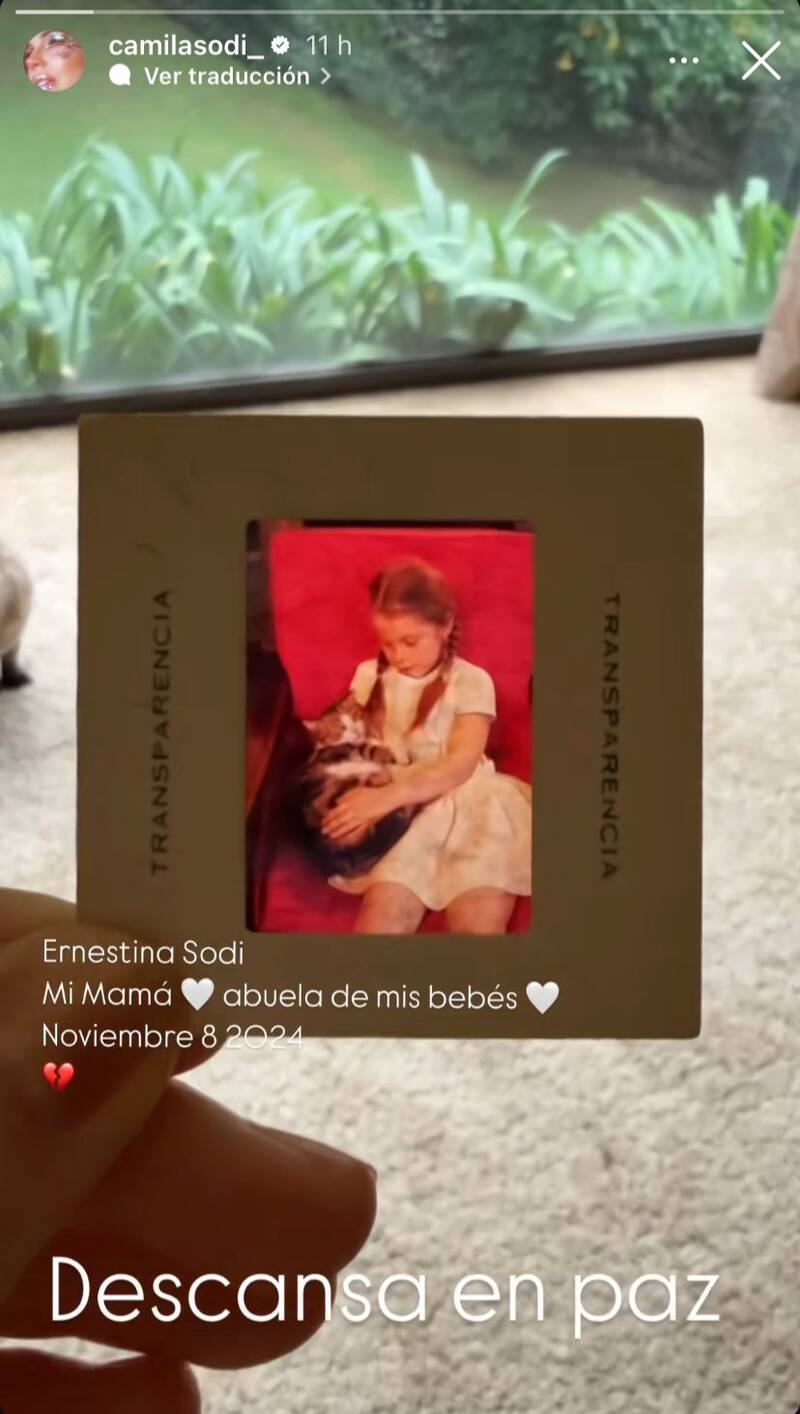 La delicada información fue confirmada por su hija, la reconocida actriz Camila Sodi, a través de una historia en su cuenta de Instagram: “Ernestina Sodi. Mi mamá, abuela de mis bebés. Noviembre 8 2024. Descansa en paz”, escribió la joven junto a una tierna foto.