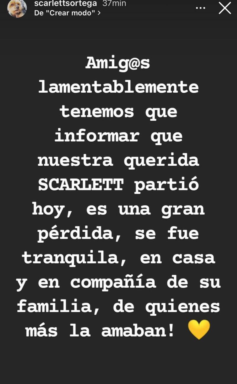 "Amigos, lamentablemente tenemos que informar que nuestra querida Scarlett partió hoy. Es una gran pérdida, se fue tranquila, en casa y en compañía de su familia, de quienes más la amaban", escribieron en la plataforma virtual.