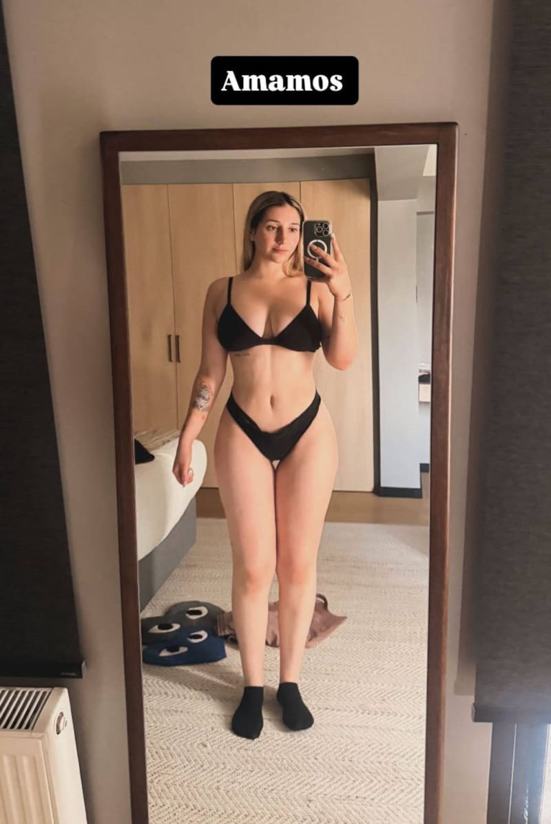 En redes sociales compartió una fotografía donde se le aprecia vistiendo un conjunto negro de estilo deportivo, compuesto por un top triangular de tirantes delgados y un bikini de corte alto en las caderas, junto al escrito “Amamos”. Sus seguidores le tiraron varias flores por su cambio físico.