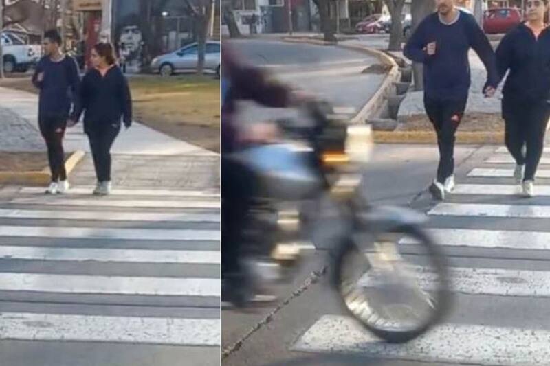 Incluso, las imágenes muestran cómo otra pareja que venía de frente se arriesga a atravesar la calle a pesar de que varios autos y motos pasaban sin frenar y a gran velocidad.