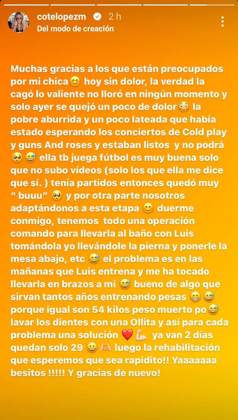 En este contexto, la modelo publicó un registro actualizando el estado de salud de la pequeña, quien se fracturó la pierna jugando una actividad de fiestas patrias.