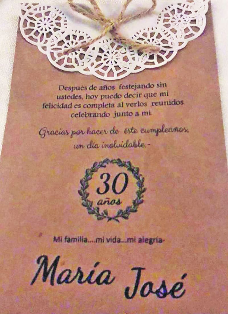 En cada puesto de las mesas, sobre el plato principal, había un recuerdo para los invitados que decía: "Después de años festejando sin ustedes, hoy puedo decir que mi felicidad es completa al verlos reunidos celebrando junto a mí".