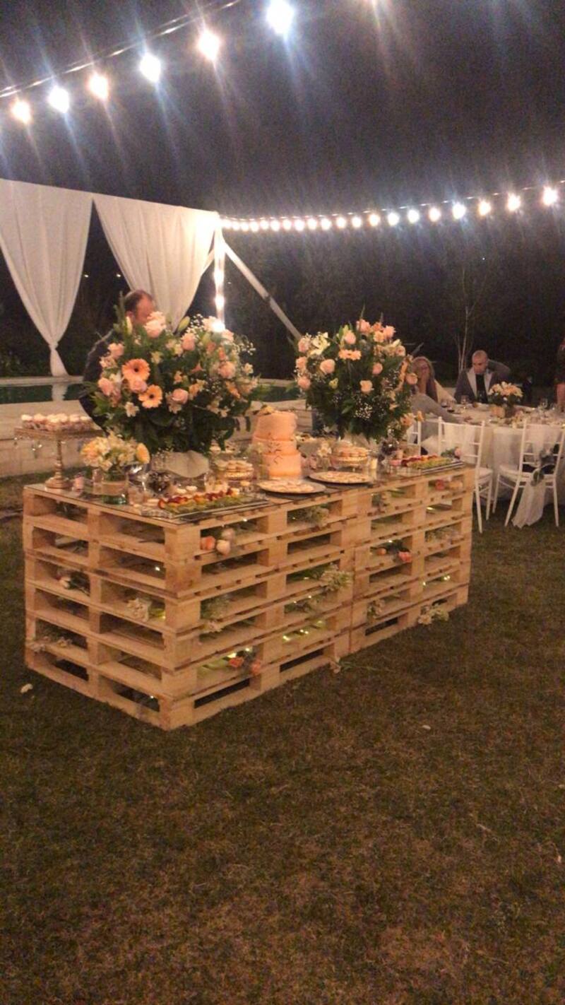 En medio del lugar había una mesa central hecha de palets de madera, donde se ubicaban los postres: brochetas de frutas, galletas, mousse de diferentes sabores y dos tortas de color rosado con aplicaciones naranjas.