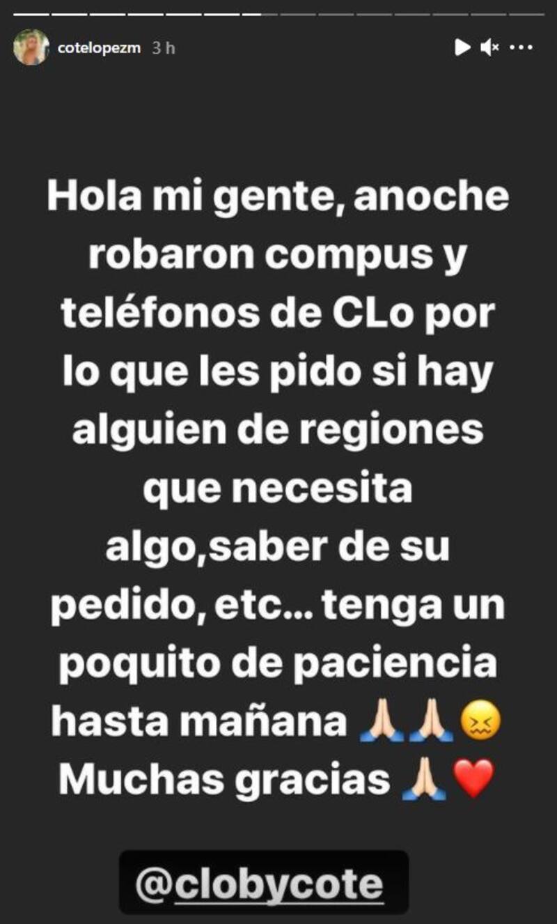 "Hola mi gente, anoche robaron compus y teléfonos de CLo", denunció el hecho la influencer en sus redes sociales.
