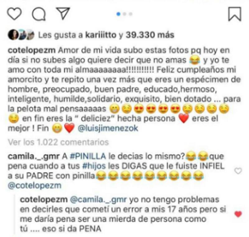 "A #PINILLA le decías lo mismo? que pena cuando a tus #hijos les DIGAS que le FUISTE infiel a su PADRE con Pinilla", comentó una seguidora en la fotografía.