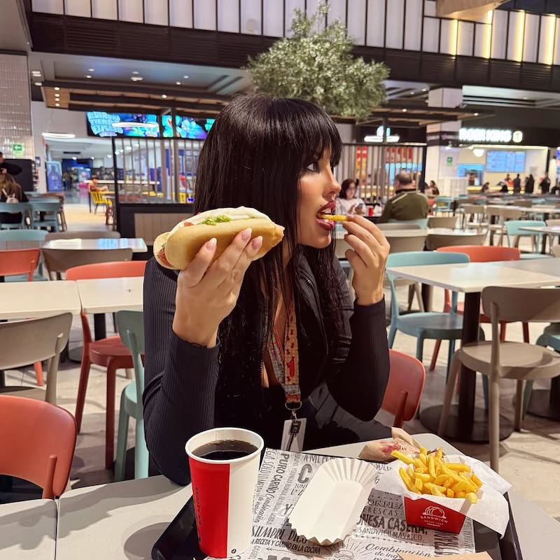 En las fotos, tomadas en un patio de comida rápida, la influencer se puede ver con largo cabello negro y chasquilla.