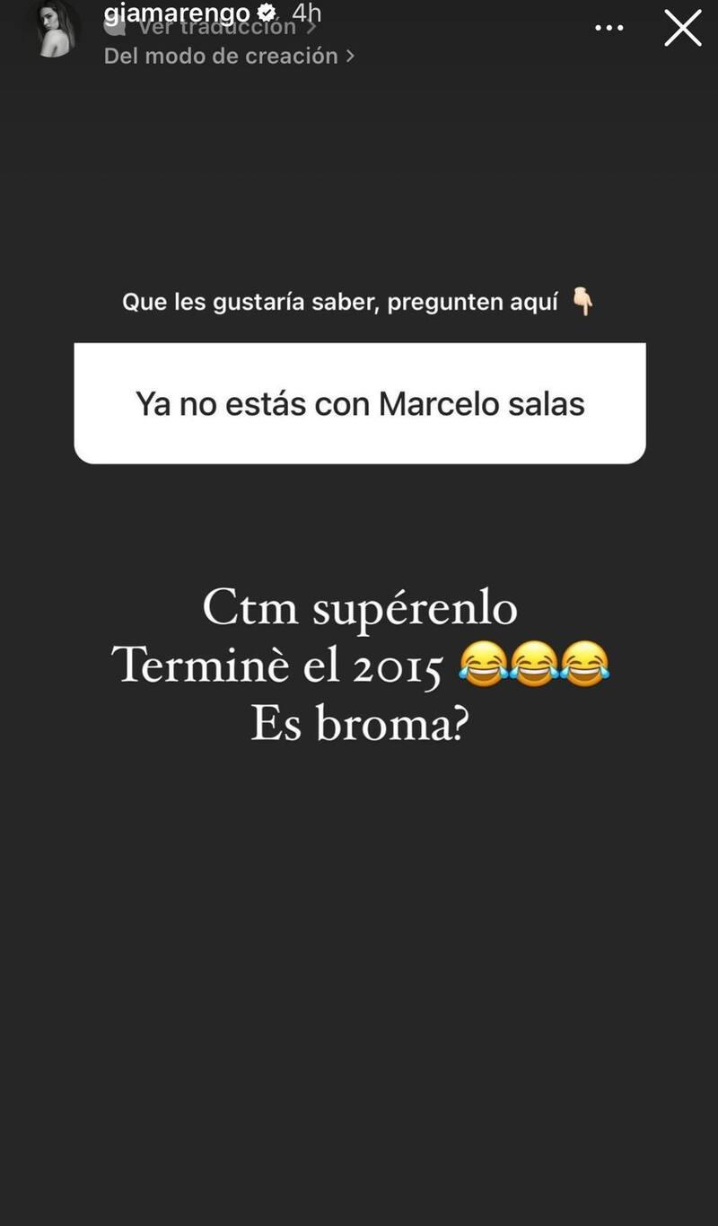Así como que no quiere la cosa, un seguidor le consultó: “¿Ya no estás con Marcelo Salas?”. Esto, en alusión al mediático romance que ambos tuvieron.