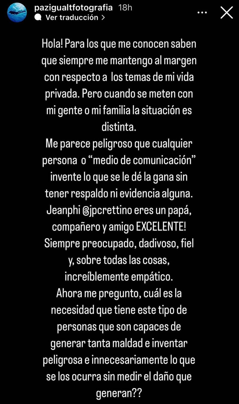 Y sobre la misma, agregó: “me parece peligroso que cualquier persona o medio de comunicación invente lo que se le dé la gana sin tener respaldo ni evidencia alguna. Jeanphi, eres un papá, compañero y amigo excelente. Siempre preocupado, dadivoso, fiel y sobre todas las cosas increíblemente empático”.