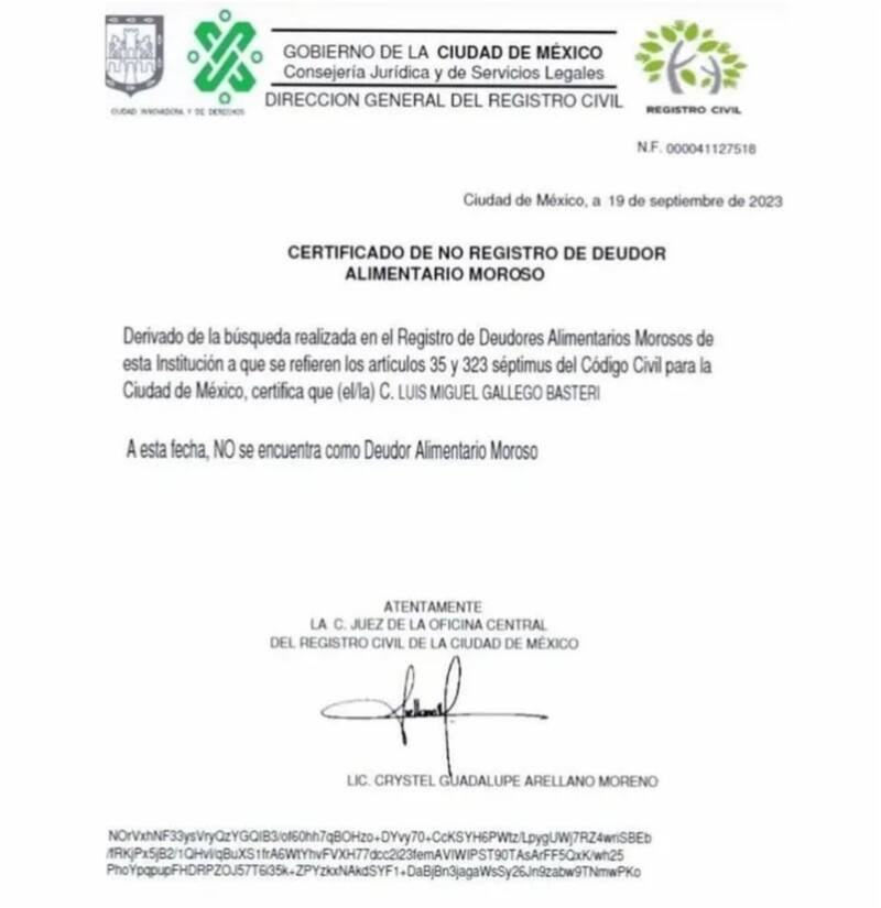 Sobre el certificado de la Consejería Jurídica y de Servicios Legales del Gobierno de la Ciudad de México que exculpa al cantante, dijo: “Que el documento haya indicado que no lo tiene registrado, en ese momento, como un deudor alimentario moroso no significa que no lo sea, es un documento real, pero no está actualizado”.