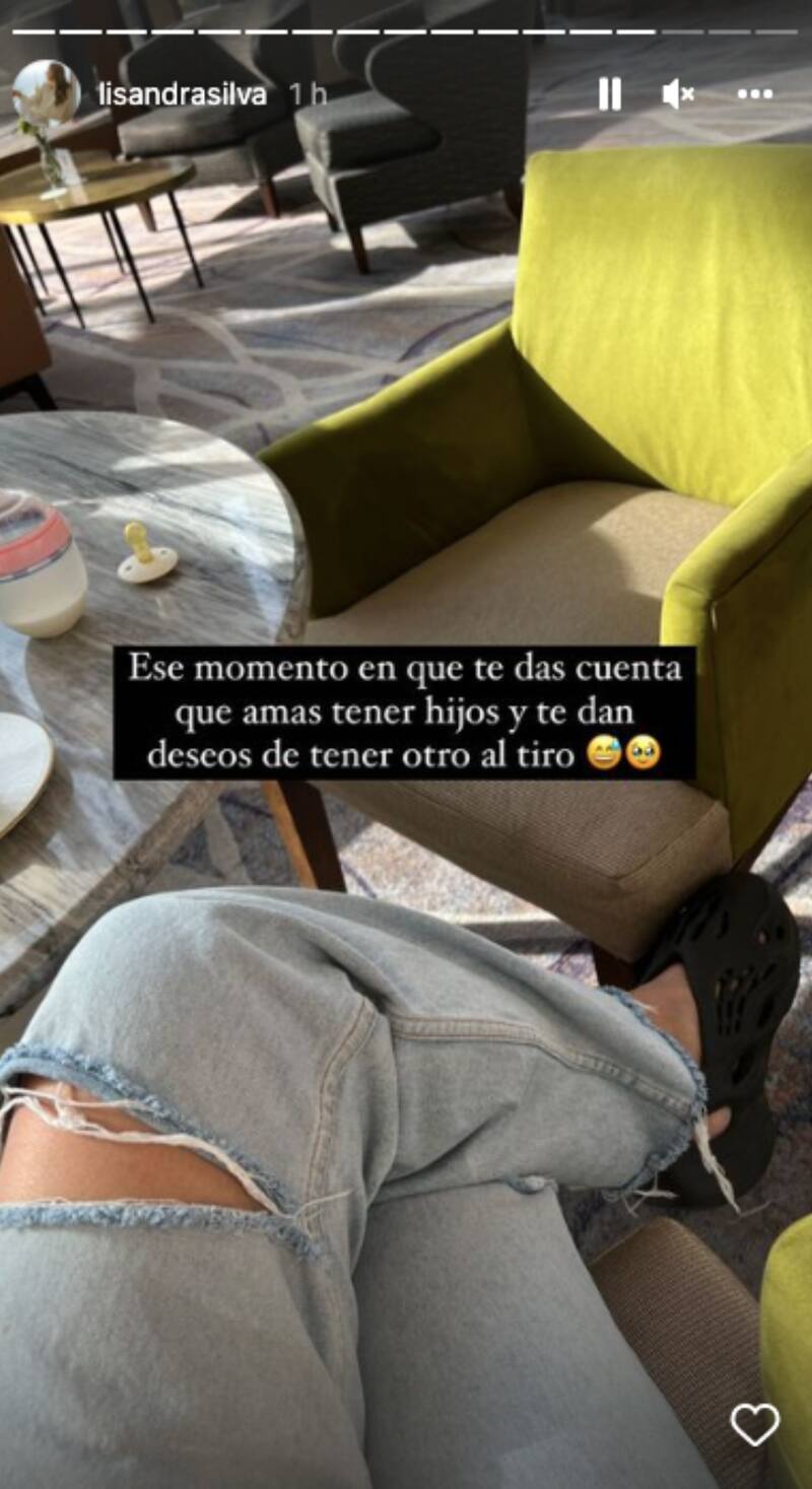 “Ese momento en que te das cuenta que amas tener hijos y te dan deseos de tener otro al tiro”, detalló en un registro donde aparece sentada en una mesita.
