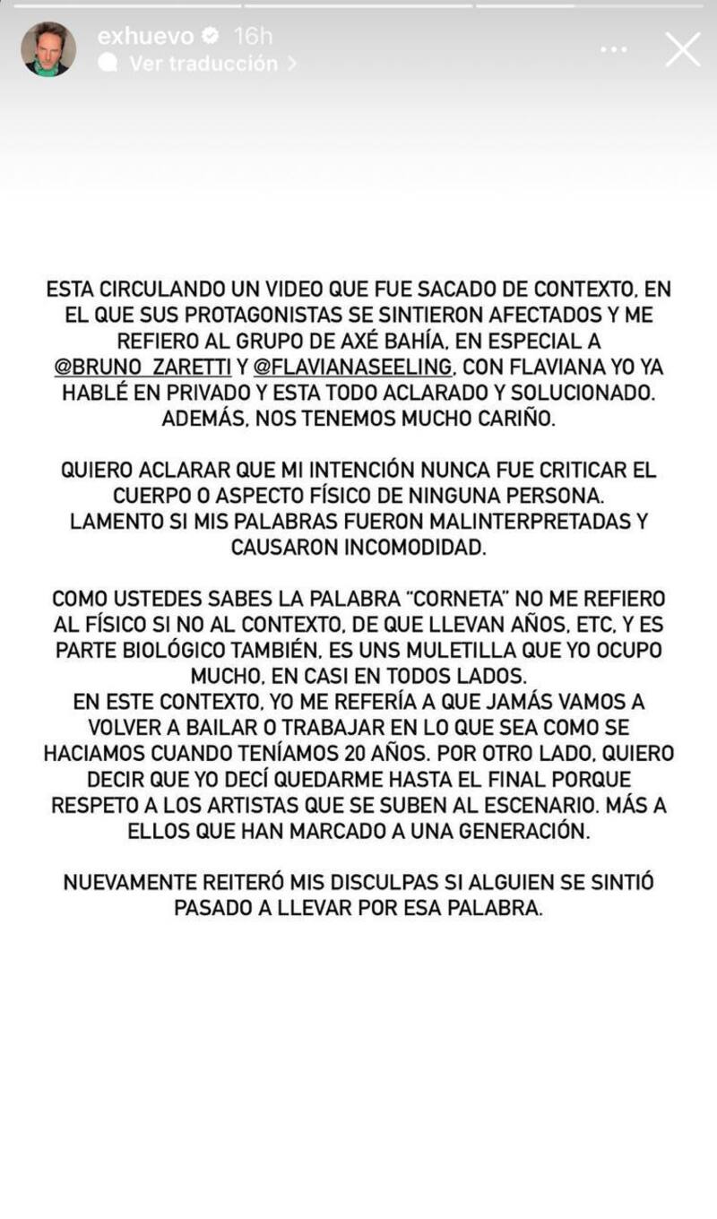 “Está circulando un video que fue sacado de contexto. En el que sus protagonistas se sintieron afectados y me refiero al grupo de Axé Bahía, en especial a @bruno zaretti y @flavianaseeling”, comenzó diciendo.