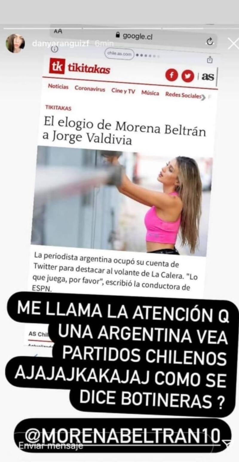 "Me llama la atención que una argentina vea partidos chilenos jajajaja como se dice botineras? @morenabeltran10", escribió Daniela, post que luego borró.
