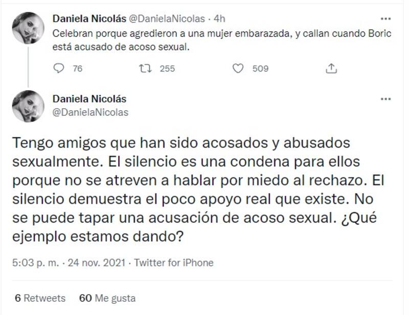 "Celebran porque agredieron a una mujer embarazada, y callan cuando Boric está acusado de acoso sexual", señaló en un tuit.