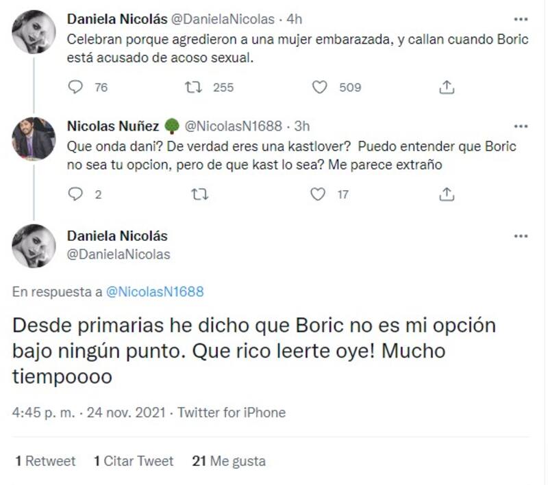 Tras la polémica, Daniela Nicolás criticó a los seguidores del candidato de Apruebo Dignidad, Gabriel Boric, recriminándolo por su presunta denuncia por acoso sexual.