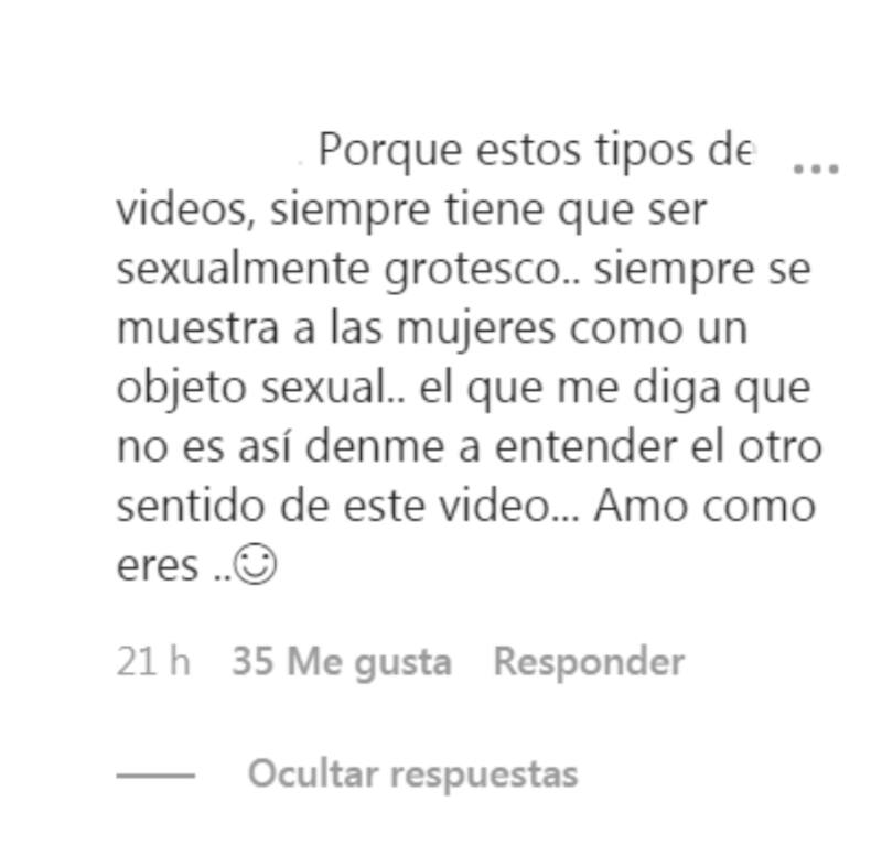 "¿Y por qué ves a la mujer como un objeto en este vídeo? Tú misma nos condicionas... ¿Por qué una mujer no puede sentirse rica, disfrutar su sexualidad y sensualidad? En qué mundo vivimos! Que nosotras mismas nos seguimos condicionando! Tú eres la que decide ver a la mujer en este vídeo como un objeto, porque yo a ambos los veo iguales, perreando, calientes, libres, humanos...", se desahogó.