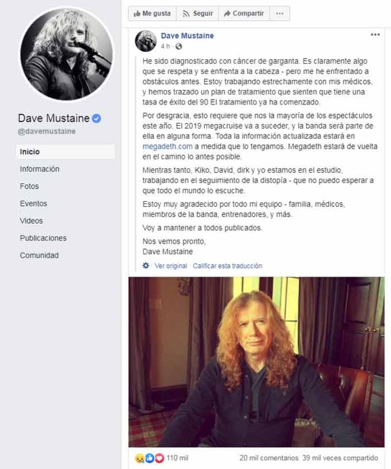 Dave Mustaine, líder de Megadeth, anunció hoy la cancelación de todos los conciertos que tenía previsto ofrecer este año. Aquello tras serle diagnosticado un cáncer de garganta.