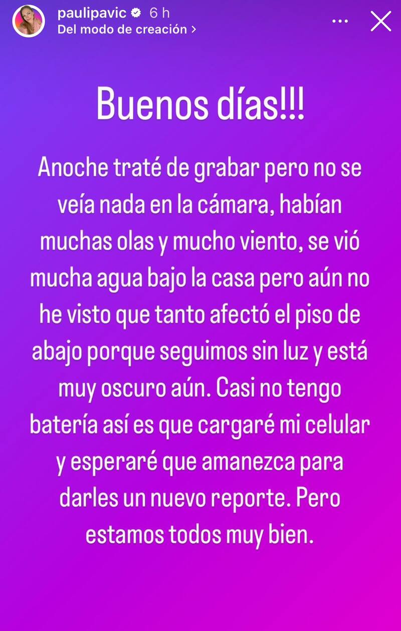 “Traté de grabar, pero no se veía nada en la cámara. Había muchas olas y mucho viento. Se vio harta agua bajo la casa, pero aún no he revisado qué tanto afectó el piso de abajo, porque seguimos sin luz y está muy oscuro aún”, contó a través de sus historias de Instagram.