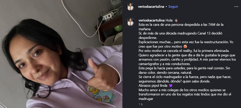 “Esta es la cara de una persona despedida a las 7 de la mañana. Sí, de más de una década madrugando, Canal 13 decidió despedirme”, escribió.
