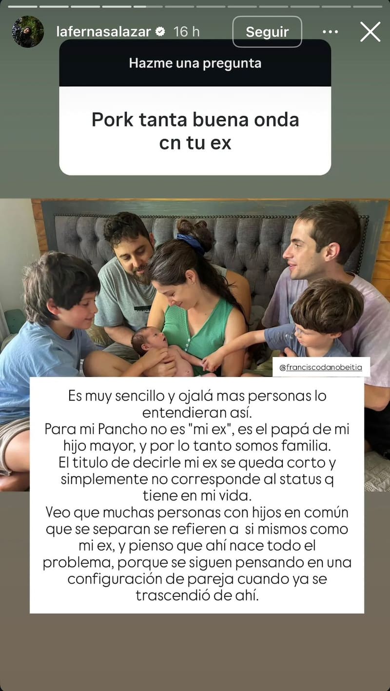 “Es muy sencillo y ojalá más personas lo entendieran así”, respondió Fernanda. “Para mi, Pancho no es ‘mi ex’, es el papá de mi hijo mayor, y por lo tanto somos familia”, añadió.