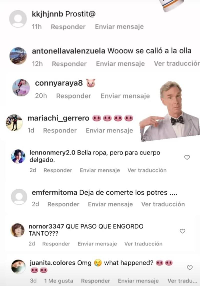 “Se cayó a la olla”, “deja de comerte los postres” o “bella ropa, pero para cuerpo delgado”, fueron sólo algunas de las reacciones que generó una de sus recientes publicaciones.
