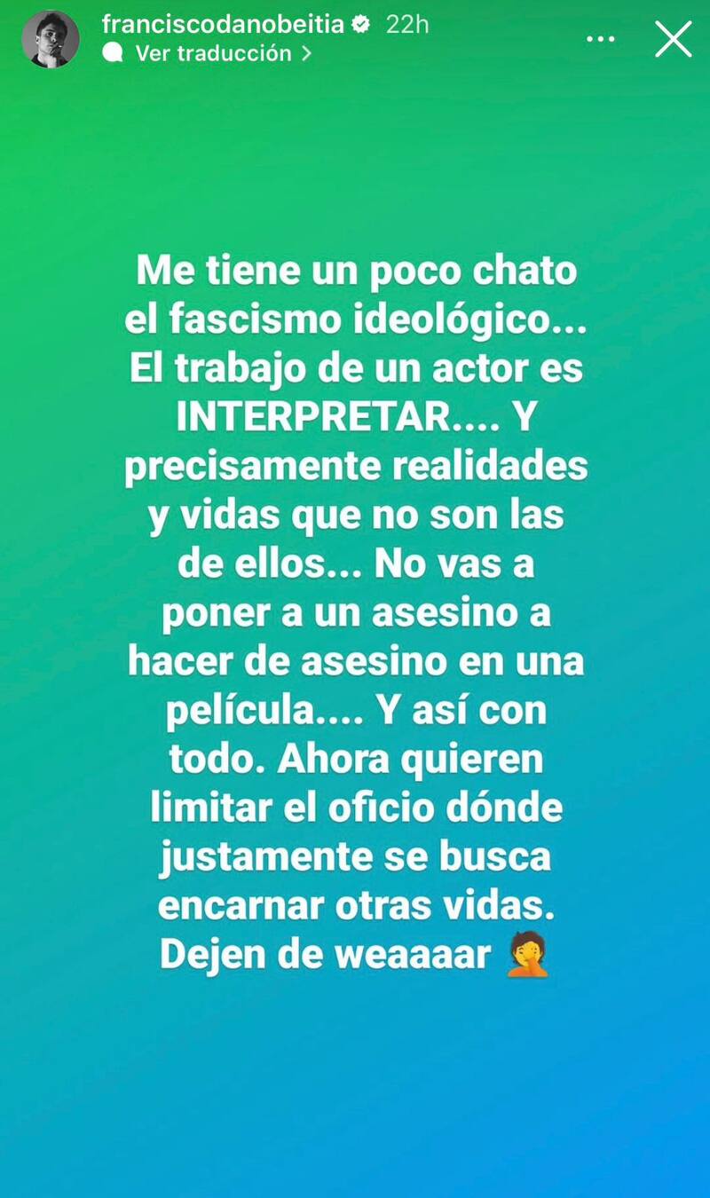 “No vas a poner a un asesino a hacer de asesino en una película. Y así con todo. Ahora quieren limitar el oficio donde justamente se busca encarnar otras vidas. ¡Dejen de hue...!”, se desahogó.