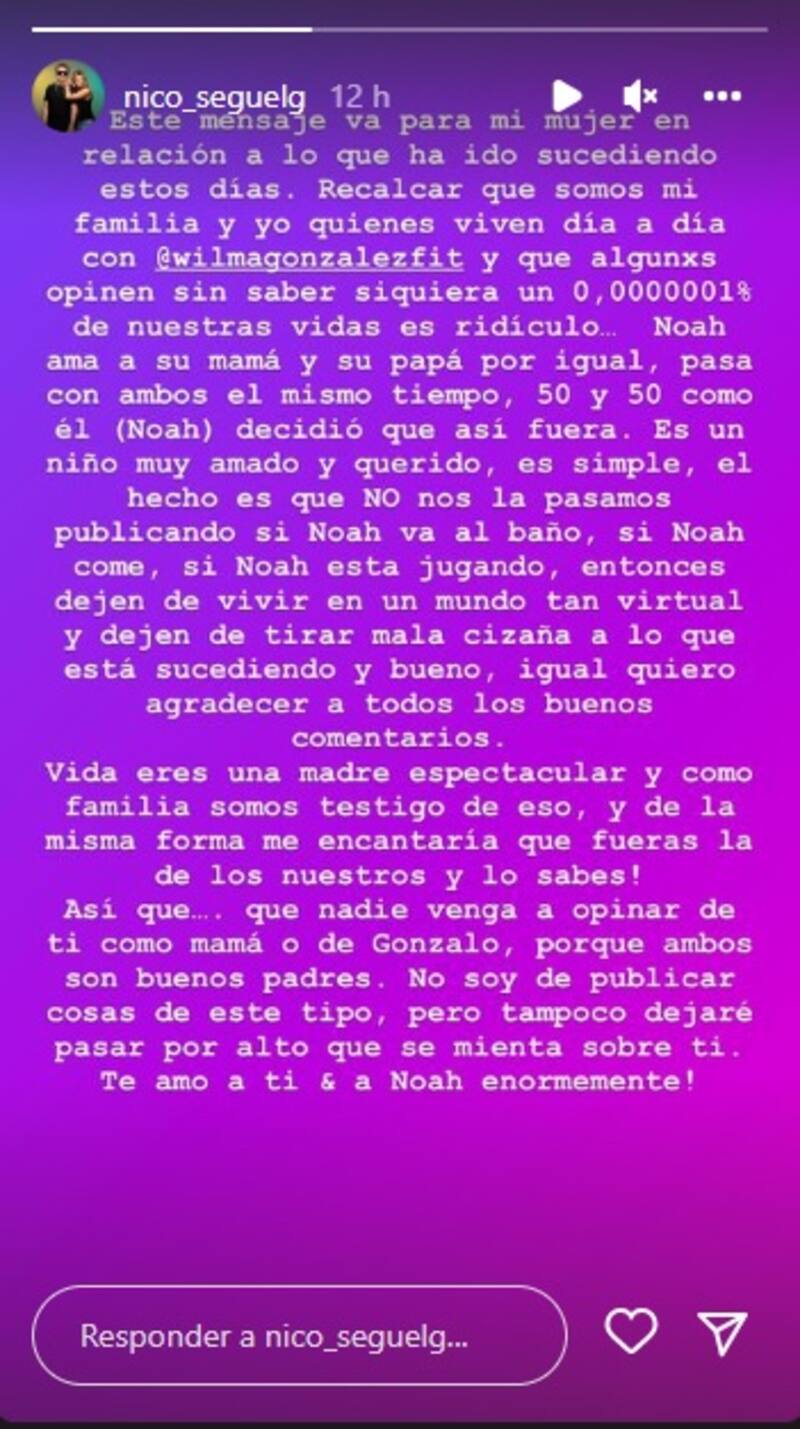 “Es un niño muy amado y querido, es simple, el hecho es que NO nos la pasamos publicando si Noah va al baño, si Noah come, si Noah está jugando, entonces dejen de vivir en un mundo tan virtual y dejen de tirar mala cizaña a lo que está sucediendo y bueno, igual quiero agradecer a todos los buenos comentarios”, continuó Nicolás.