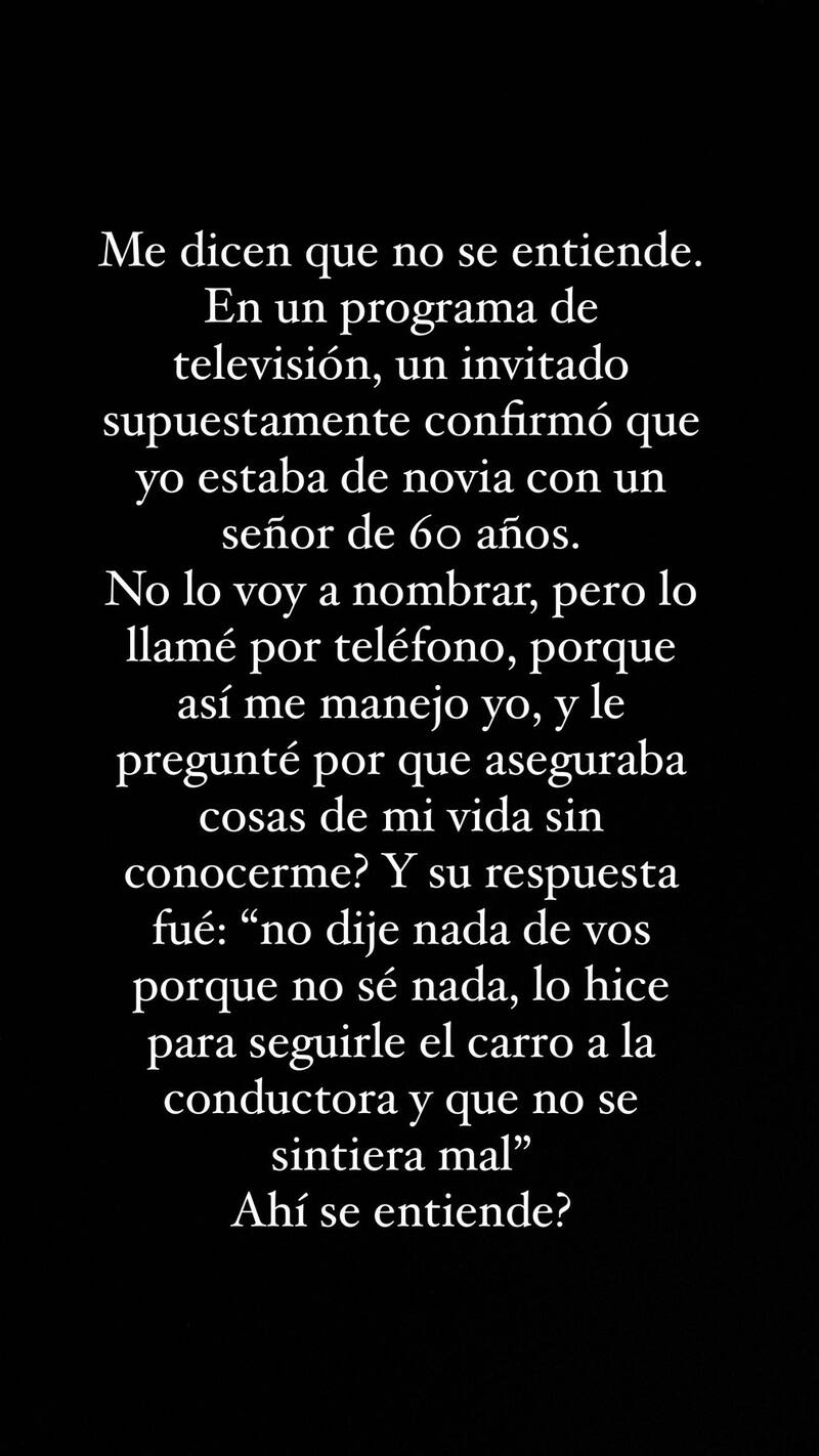 En una suerte de comunicado, la argentina continuó: “Y su respuesta fue: ‘no dije nada de vos porque no sé nada, lo hice para seguirle el carro a la conductora y que no se sintiera mal’. ¿Ahí se entiende?”.