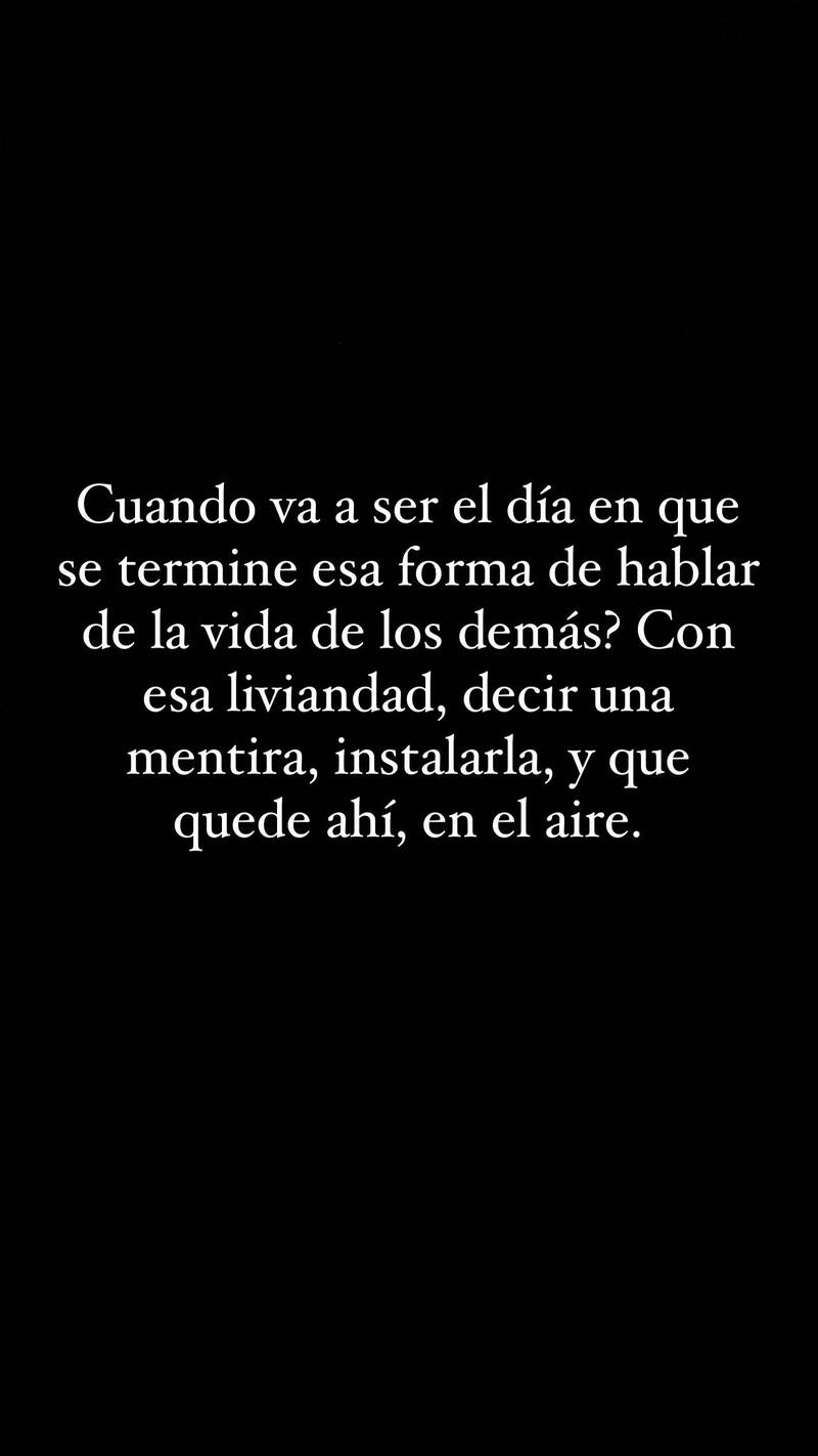 “¿Cuándo va a ser el día en que se termine esa forma de hablar de la vida de los demás? Con esa liviandad, decir una mentira, instalarla y que quede ahí, en el aire”, concluyó la actriz.