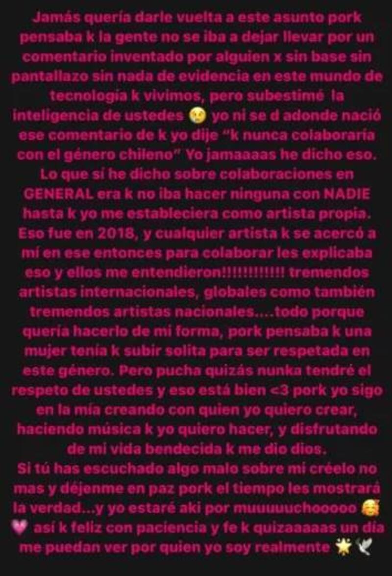 Y sobre la misma, agregó: “Ni sé de dónde nació ese comentario que (supuestamente) dije ‘nunca colaboraría con el género chileno’. Yo jamás he dicho eso. Lo que sí he dicho sobre colaboraciones en GENERAL, era que no iba a hacer ninguna con NADIE, hasta que yo me estableciera como artista propia”.