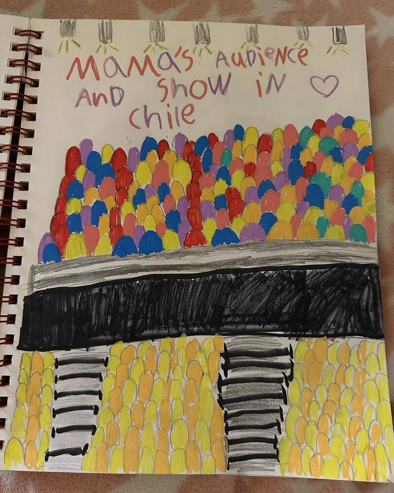 Fue allí donde su hija de ocho años estuvo incluso presente al costado del escenario mientras su mamá cantaba, por eso es que en medio de los ensayos, aprovechó de dibujar a los fanáticos de la estrella.