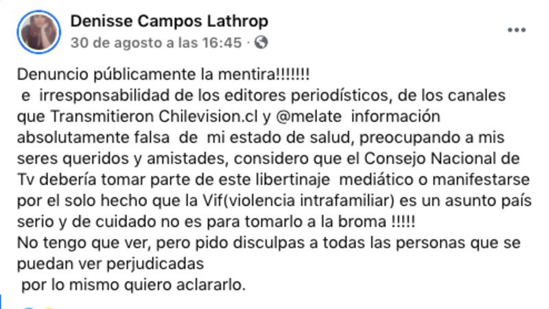 Sin embargo, Denisse reaccionó. Con una publicación en su cuenta de Facebook, desmintió la publicación de Rojas. "Denuncio públicamente la mentira!!!!!!! e irresponsabilidad de los editores periodísticos, de los canales que Transmitieron Chilevision.cl y @melate", escribió.