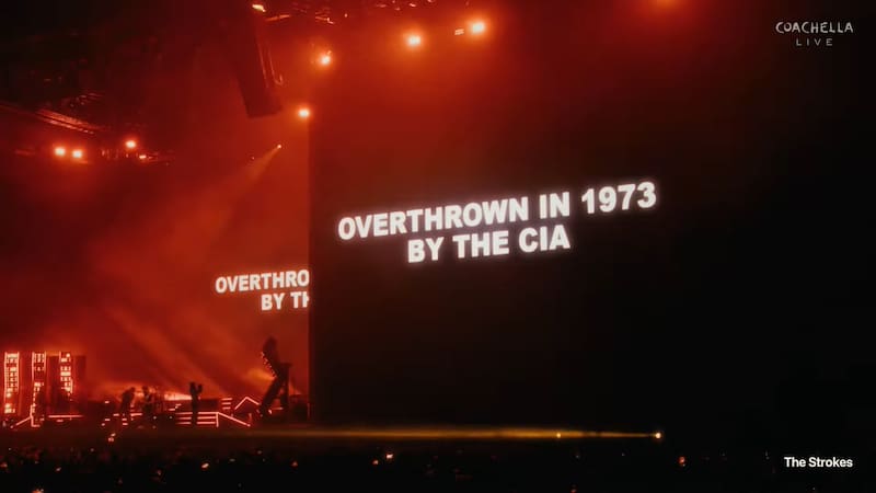 Junto a la canción, que incluye la frase “¿De qué lado estás?” en el coro, el grupo liderado por Julian Casablancas proyectó en las pantallas distintas imágenes de episodios en los que se acusa la intervención de la Agencia Central de Inteligencia (CIA por su sigla en inglés) de Estados Unidos.