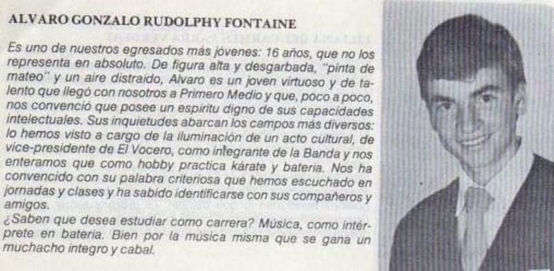 "Es uno de nuestros egresados más jóvenes: 16 años, que no los representa en absoluto", se lee en el anuario de 1980 cuando Rudolphy salía de cuarto medio.