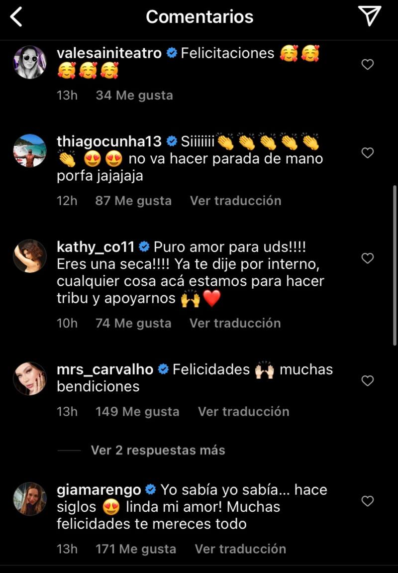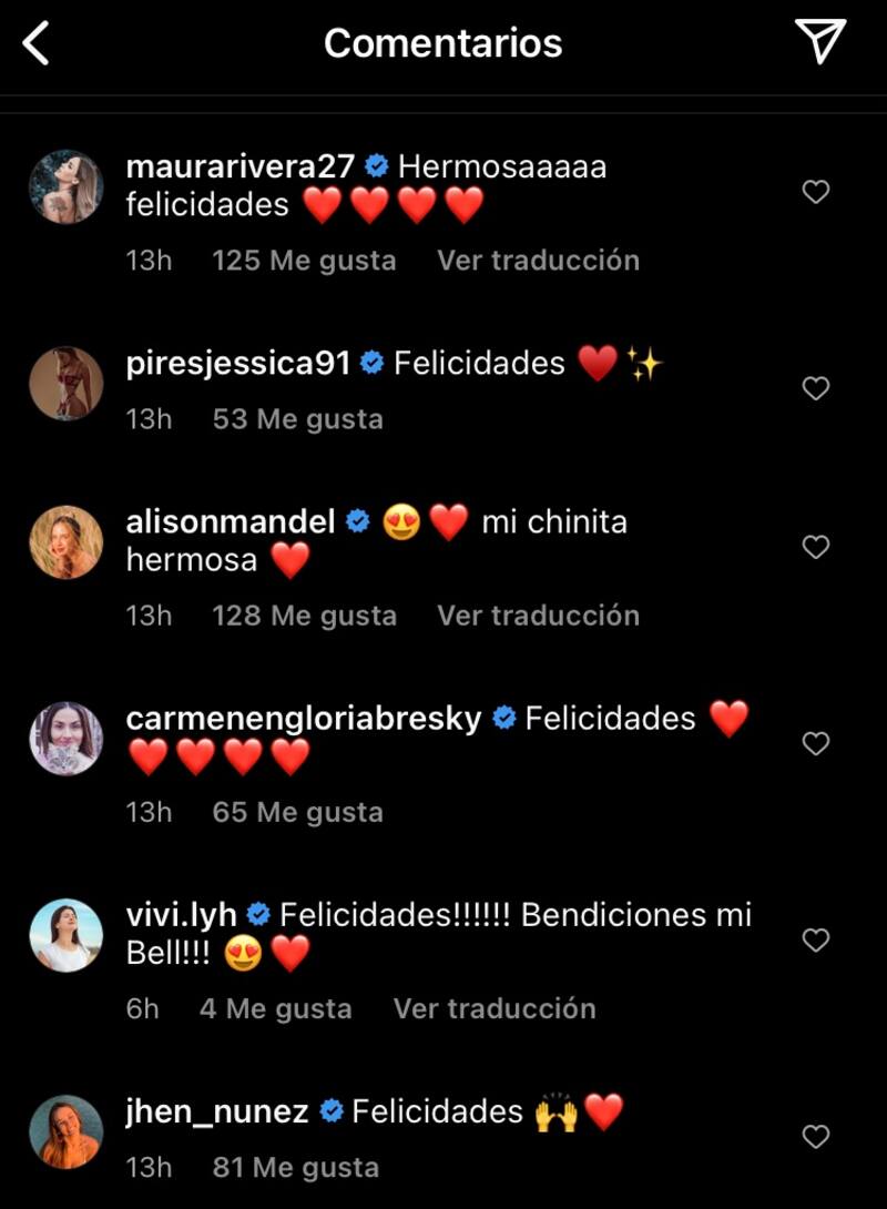 La gimnasta recibió cariñosos comentarios de Maura Rivera, Alison Mandel, Carmen Gloria Bresky, Gianella Marengo, Kathy Contreras, Michelle Carvalho, Joche Bibbó, Thiago Cunha, entre otros.