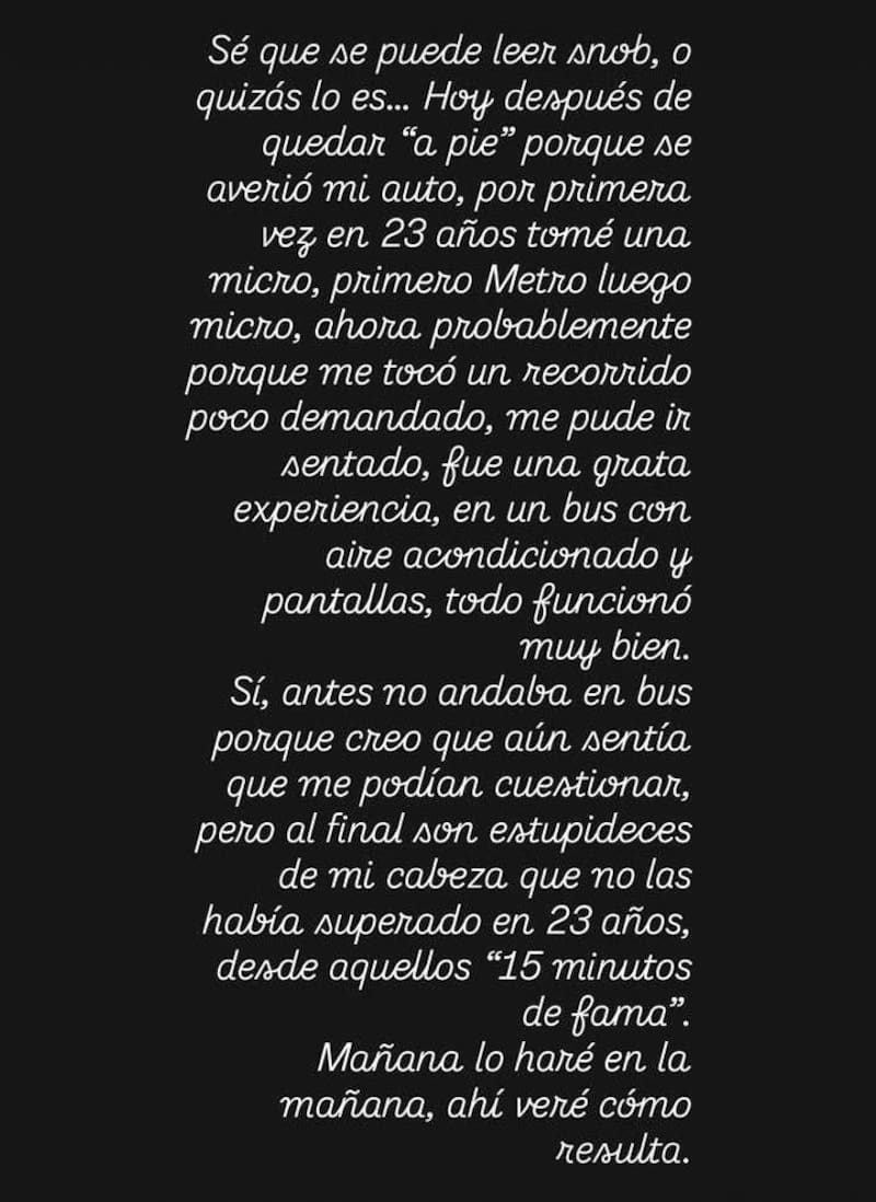 “Sé que puede leerse snob o quizás lo es… Pero hoy, tras quedar a pie porque se averió mi auto, por primera vez en 23 años tomé una micro: primero metro, luego micro”, escribió en una historia que subió a la mencionada plataforma virtual.