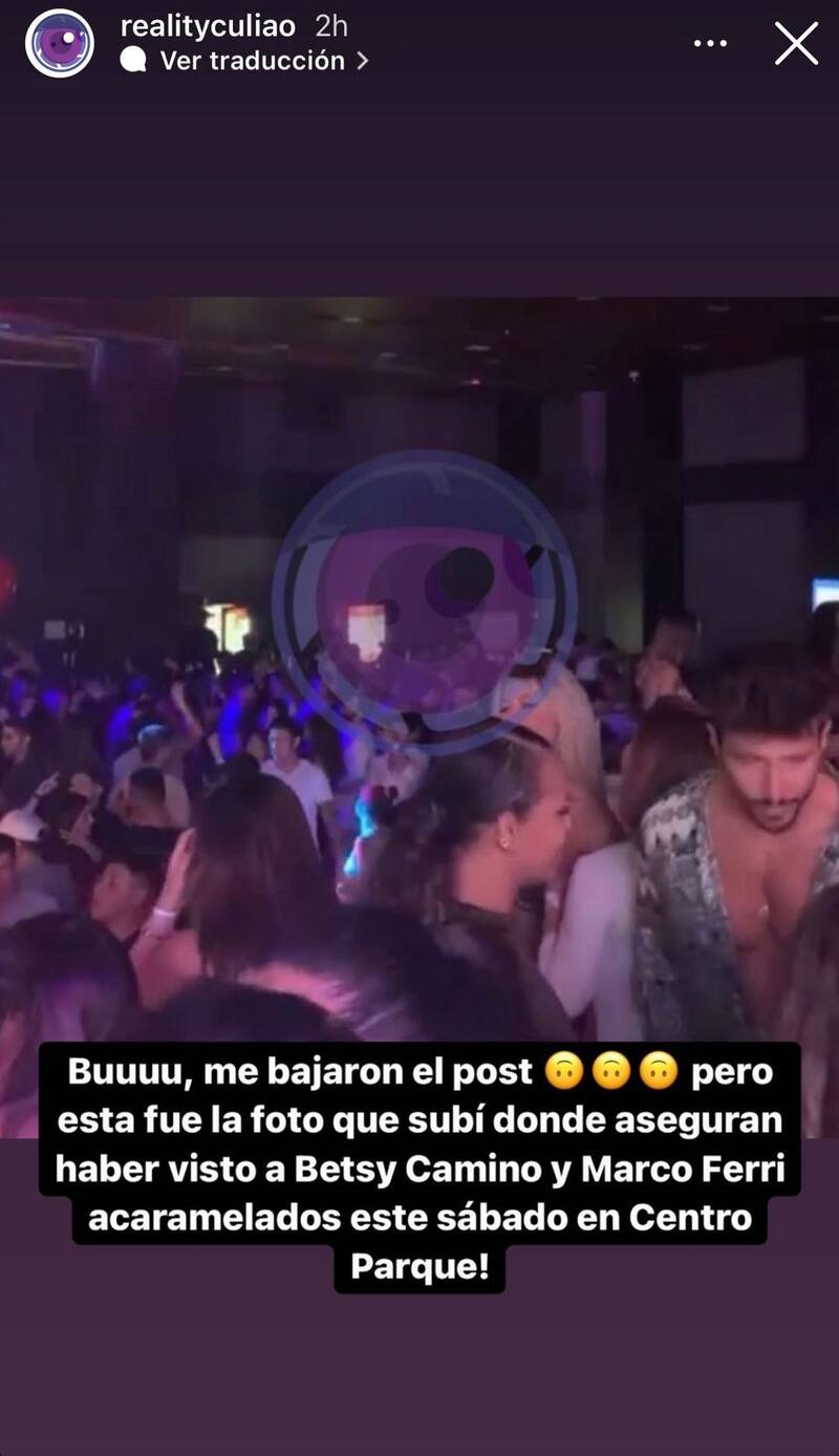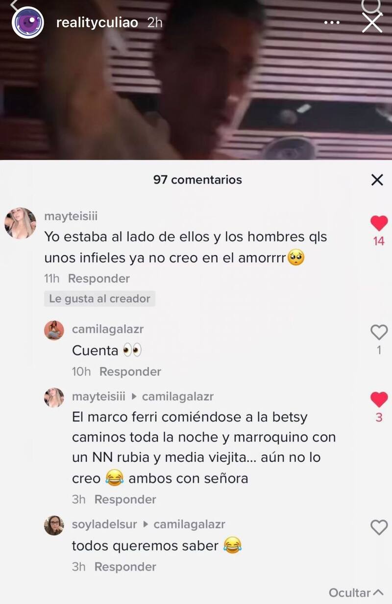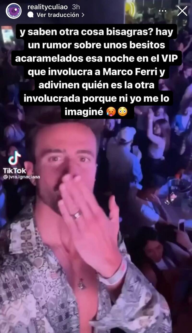 “Hay un rumor sobre unos besitos acaremalados esa noche en el vip que involucra a Marco Ferri y adivinen quién es la otra involucrada porque ni yo me lo imaginé”, escribió el mencionado perfil antes de dar el nombre de la otra parte.