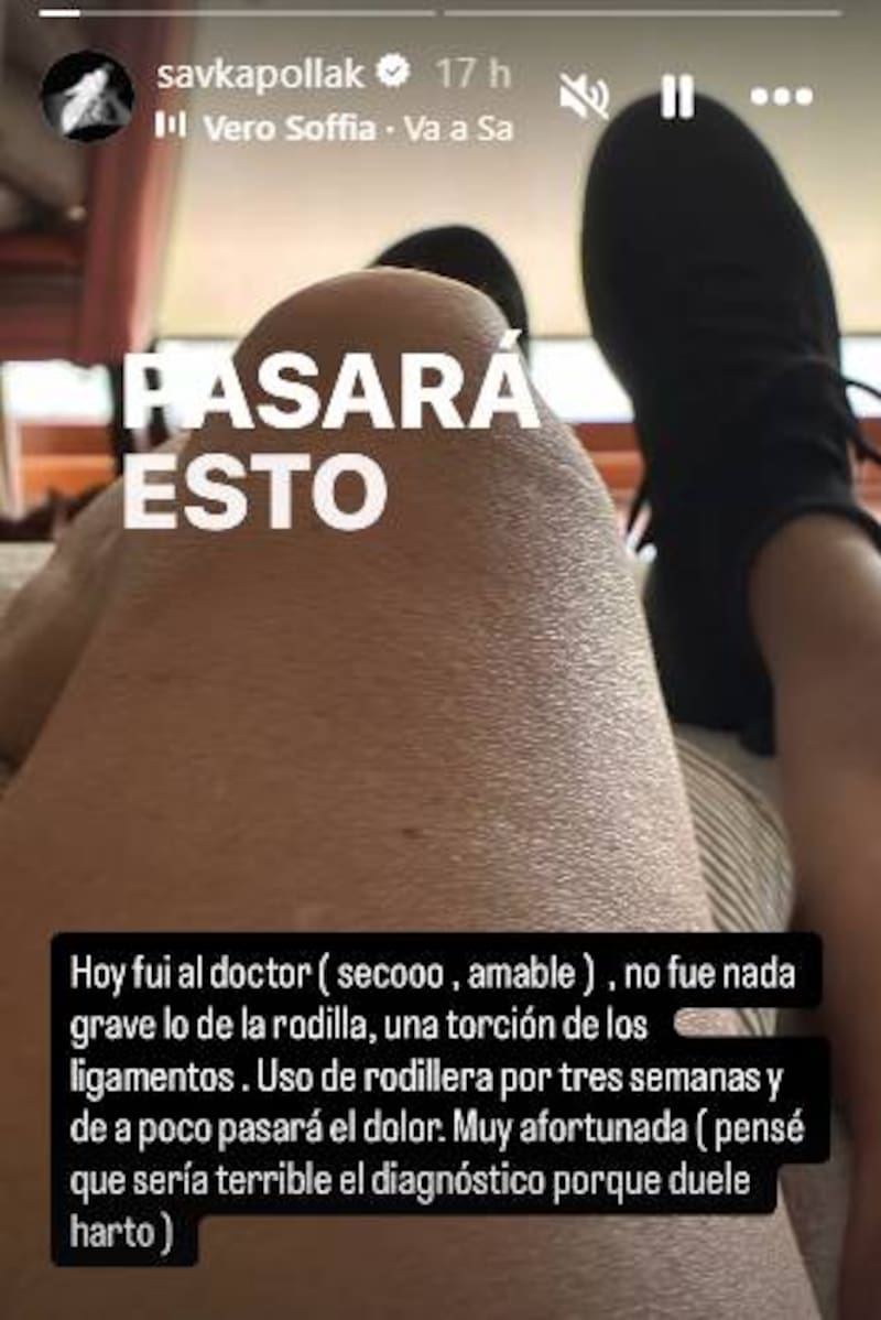 “Uso de rodillera por tres semanas y de a poco pasará el dolor. Muy afortunada“, complementó junto a una imagen en la que mostró la zona afectada.