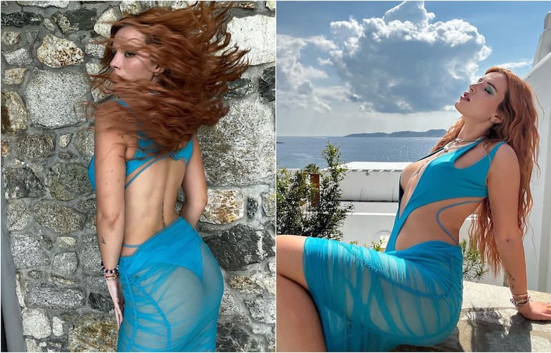 La actriz con más de 25 millones de seguidores en la red social, subió varias fotografías vistiendo un destapado trikini celeste eléctrico, y una falda transparente en el mismo tono.