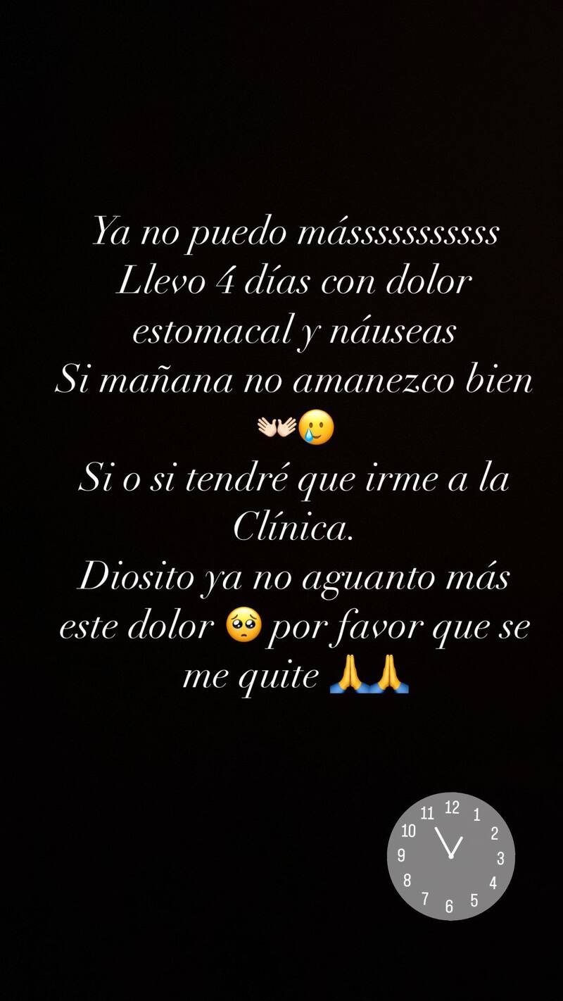 “Ya no puedo más. Llevo cuatro días con dolor estomacal y náuseas. Si mañana no amanezco bien sí o sí tendré que irme a la clínica”, se puede leer en el posteo.