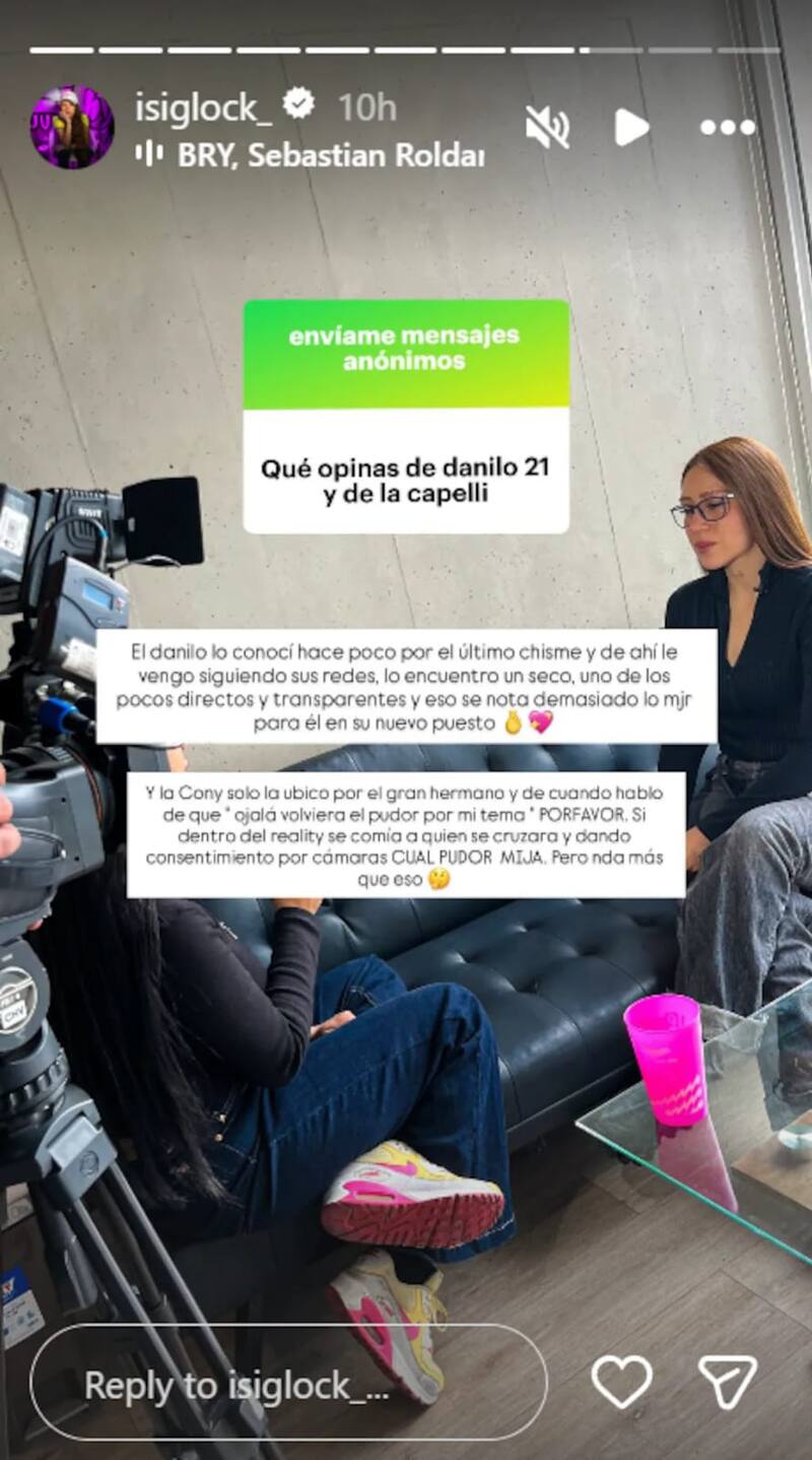 Varias semanas después de eso, la DJ hizo una dinámica de preguntas y respuestas con sus seguidores de Instagram, donde fue consultada sobre su opinión de Capelli y Danilo 21.
