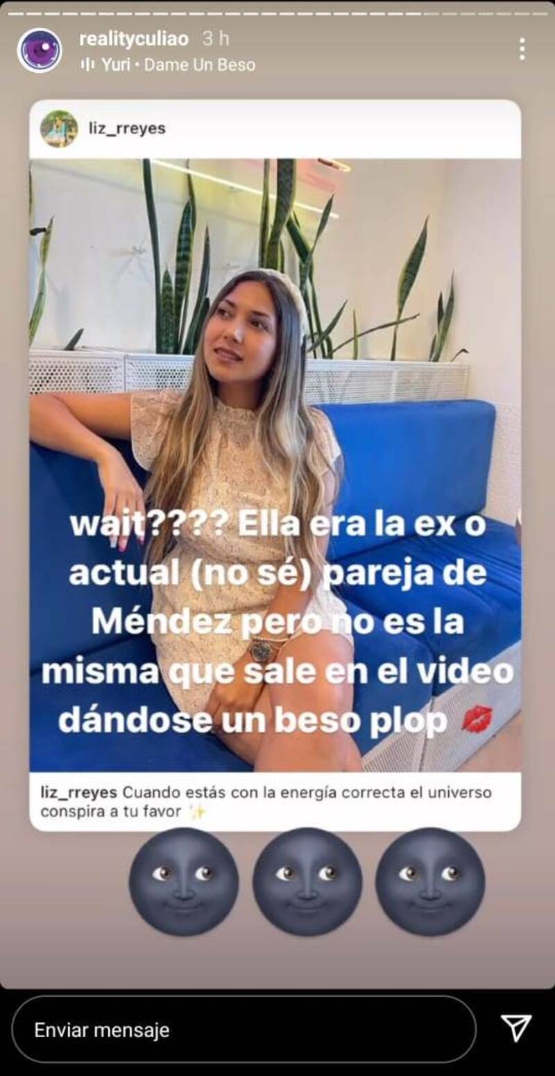 “Ella era la ex o actual (no sé) pareja de Méndez, pero no es la misma que sale en el video dándose un beso, plop”, detalló, compartiendo el registro donde se ve al músico besando a una joven.