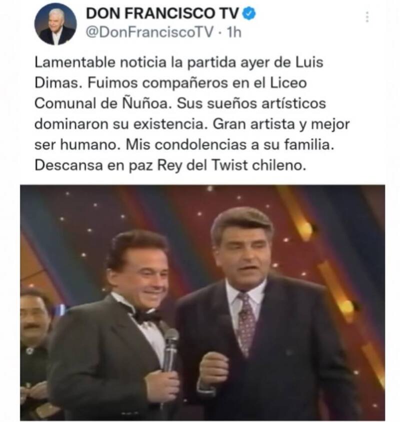 "Lamentable noticia la partida de Luis Dimas. Fuimos compañeros en el Liceo Comunal de Ñuñoa. Sus sueños artísticos dominaron su existencia. Gran artista y mejor ser humano. Mis condolencias a su familia. Descansa en paz, rey del twist chileno".